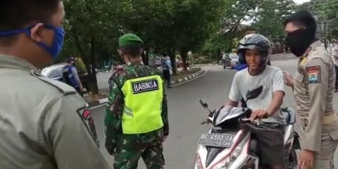 ASLIKARTU NEWS - Petugas Satpol PP didukung TNI-Polri yang melakukan operasi penertiban di kawasan Jalan Demang Lebar Daun, Palembang hari ini. 13 pengendara sepeda motor yang kedapatan berada di jalan protokol tanpa memakai masker dikarantina. AGEN DOMINO